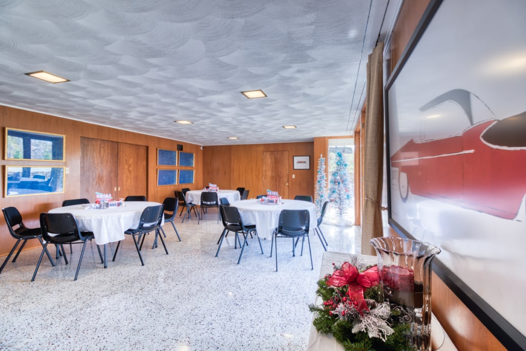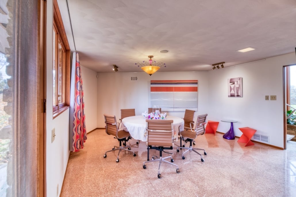 The Harry Cooler Conference Center is a 3 level 2800sf fully restored mid century modern home located on 7 wooded acres. Occupancy is limited to 50 persons including staff/catering for an indoor event and 125 for outdoor. The main level is a stunning replica of a idyllic mid century modern residence. The mid level Consists of 2 meeting spaces. The former master bedroom houses an original Frank Lloyd Wright conference table with seating up to 9 persons. The second bedroom is a modernist lounge with seating for 10. The lower lever can be set up in a variety of configurations: